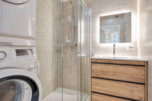 De badkamer is modern en smaakvol afgewerkt en voorzien van een ruime inloopdouche. Daarnaast beschikt de ruimte over een praktisch wastafelmeubel met opbergruimte, en zijn de aansluitingen voor de wasmachine en droger netjes verwerkt.