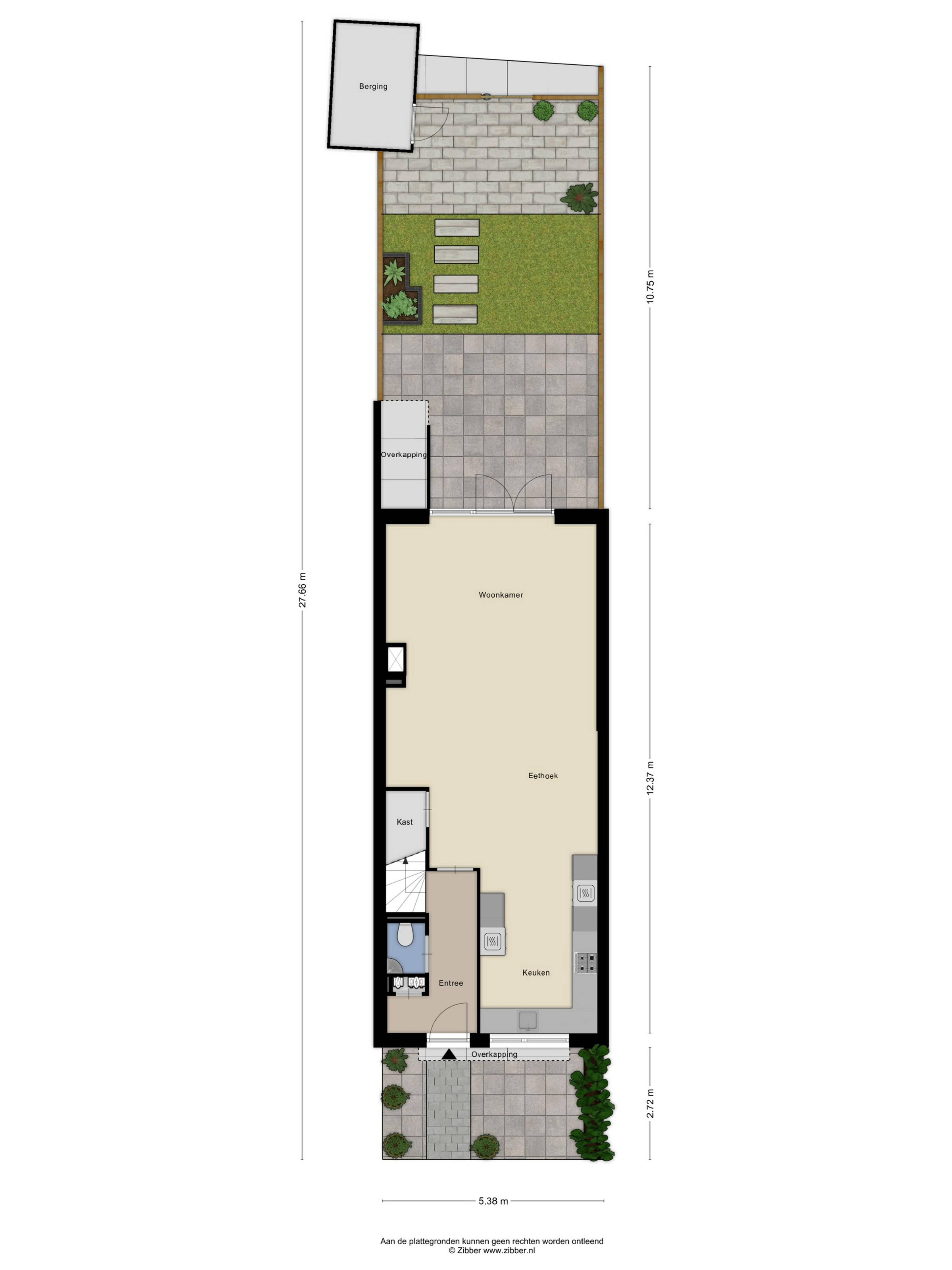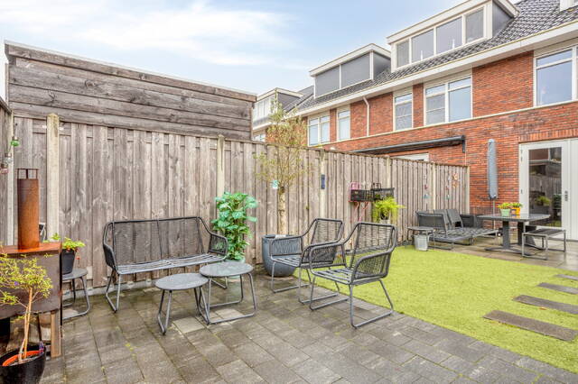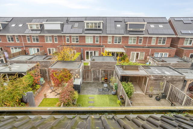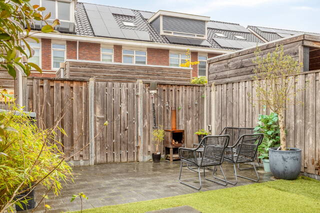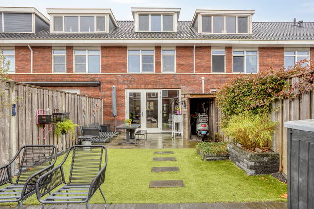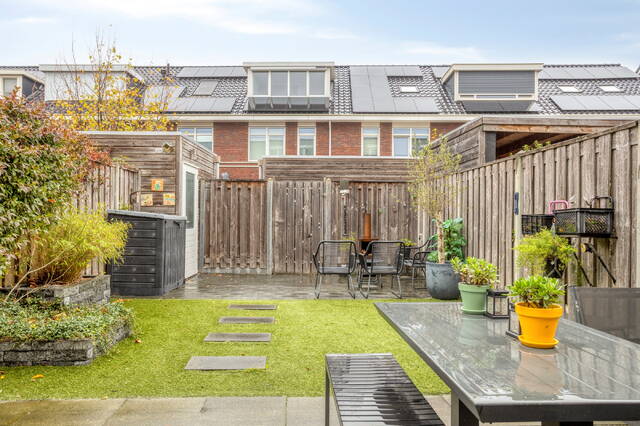 De achtertuin op het westen is een heerlijke plek om te ontspannen en te genieten van de middag- en avondzon. De tuin is sfeervol aangelegd met nette sierbestrating, groene borders en tuinverlichting, waardoor je ook in de avonduren gezellig buiten kunt zitten. Achterin staat een vrijstaande berging met elektra, ideaal voor het opbergen van fietsen of tuingereedschap. Aan de gevel van de woning is een praktische overkapping gemaakt, goed voor 2 fietsen of het opbergen van de barbecue. Daarnaast is de tuin bereikbaar via een achterom.