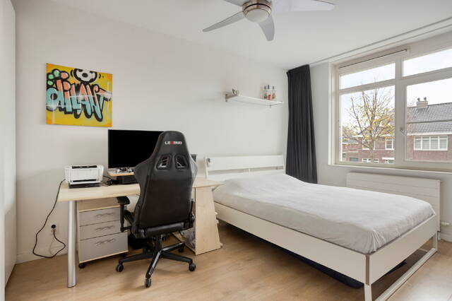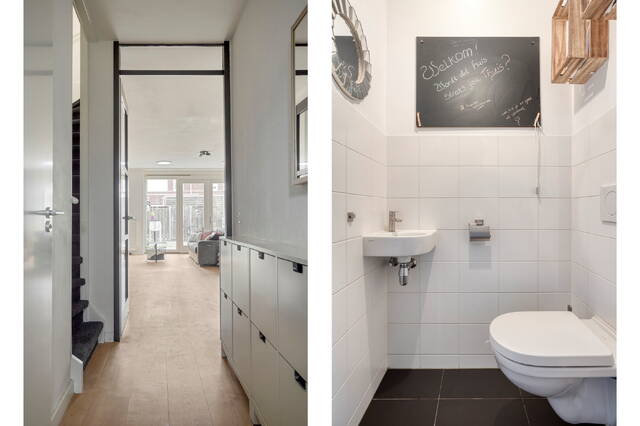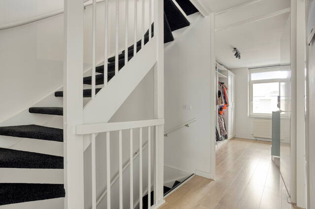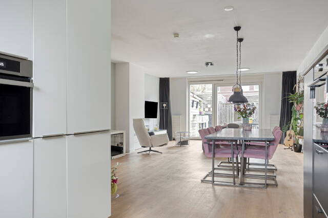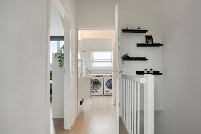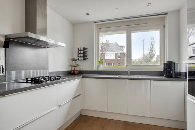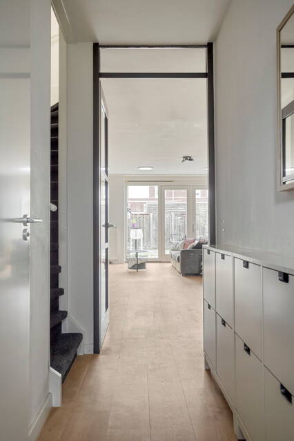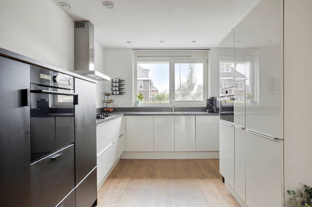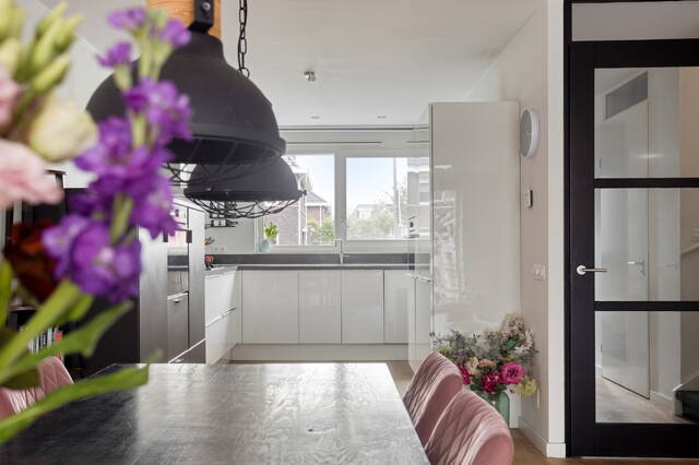 Upon entering, you immediately feel the spacious atmosphere of this home. The hallway is bright and features a neatly finished guest toilet and a modern utility cabinet. The rear extension is equipped with light tubes, allowing extra daylight to flow in and making the space feel open and inviting. The living room exudes comfort and style, with a wooden floor (freshly varnished in 2024), smooth walls, and a cozy fireplace. French doors open onto the sunny backyard. At the front of the house, you’ll find the modern open kitchen, fully equipped with a fridge-freezer combination, additional refrigerator and freezer, luxury oven, combination microwave, Quooker, 4-burner gas stove, and stainless steel extractor hood. The smart layout and built-in storage under the stairs provide ample storage space.