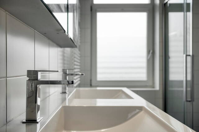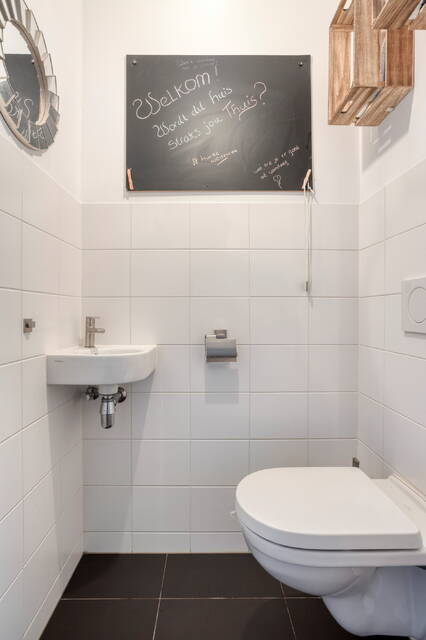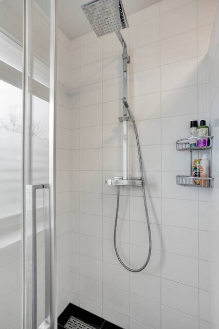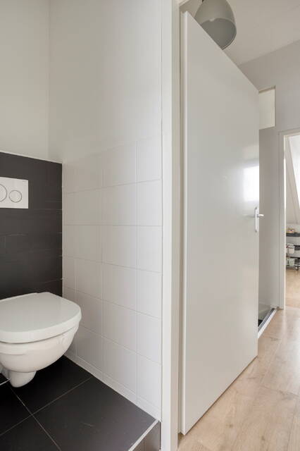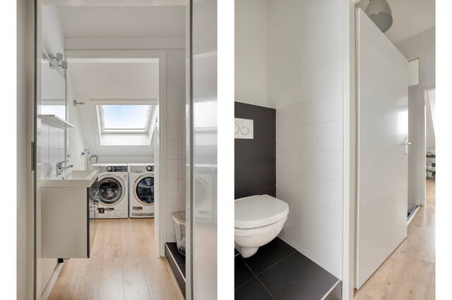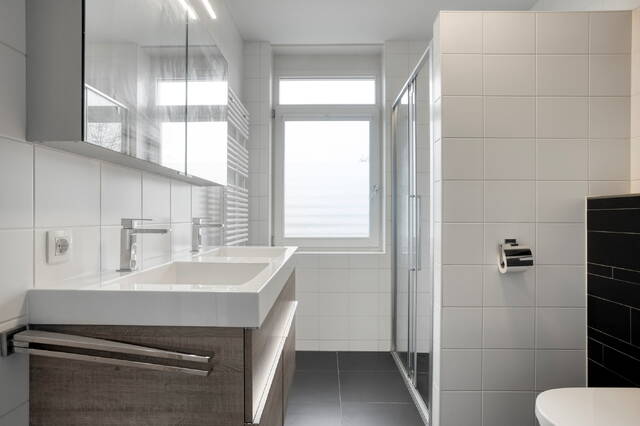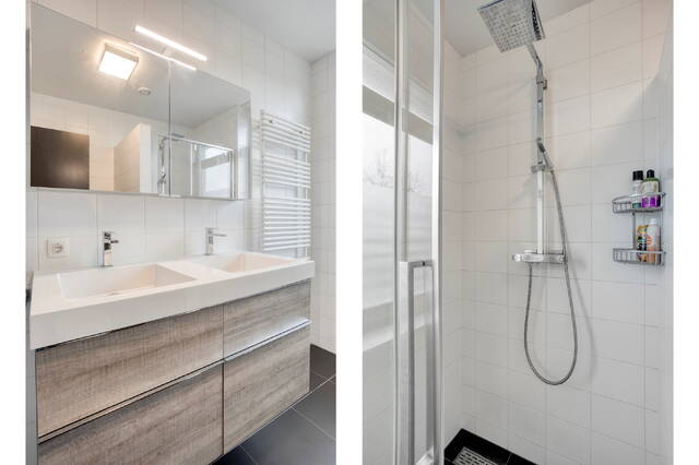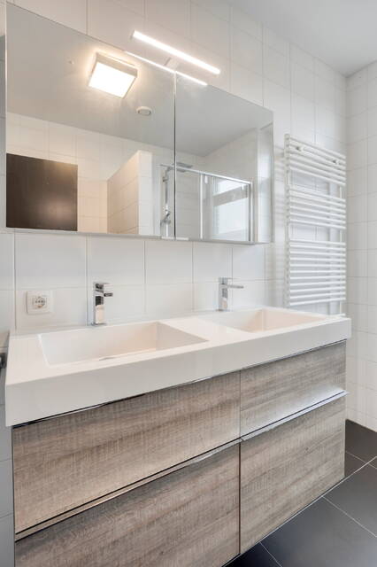 De moderne badkamer is royaal opgezet en biedt volop comfort. Je vindt hier een inloopdouche, tweede toilet en een dubbel wastafelmeubel met praktische opbergruimte.