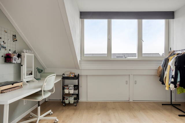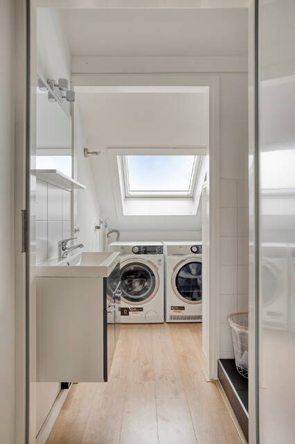 The top floor has two spacious bedrooms, both with dormer windows that let in plenty of natural light, creating a bright and airy feel. Both rooms also offer ample storage space cleverly integrated under the slanted ceilings. This floor includes sunscreens, insect screens, and a third toilet with washbasin, located in the technical/laundry room. Here you’ll also find the central heating system and connections for laundry appliances. A skylight brings in extra daylight, and a loft above the landing provides even more storage space.