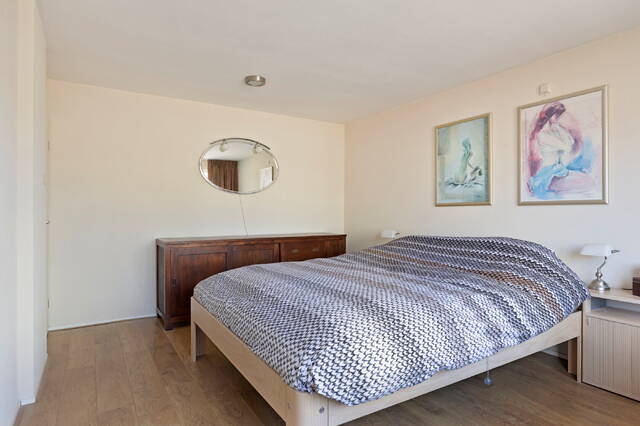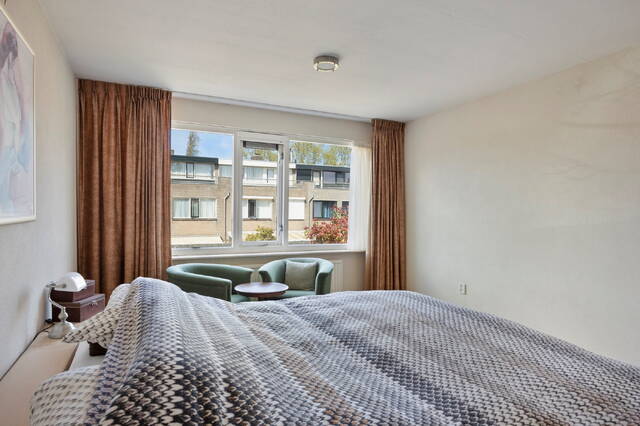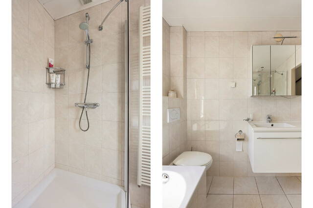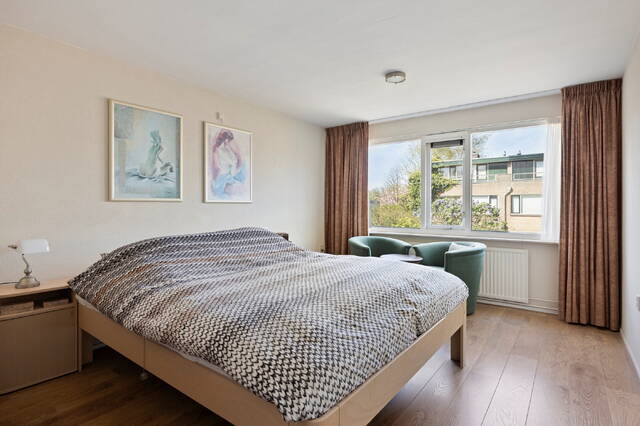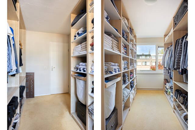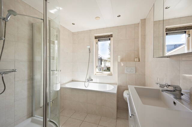 Op de eerste verdieping bevinden zich drie slaapkamers. De royale master bedroom ligt aan de achterzijde van de woning en biedt volop ruimte voor een groot tweepersoonsbed en een ruime kledingkast. Dankzij de grote raampartijen is deze kamer bovendien heerlijk licht en voelt deze extra ruim aan. Aan de voorzijde bevindt zich een eveneens ruime slaapkamer, die voldoende plek biedt voor een bed en een kast. Ook deze kamer is prettig licht en flexibel in te delen, bijvoorbeeld als kinderkamer, werkkamer of logeerruimte. De derde kamer wordt nu gebruikt als inloopkast maar is ook prima te gebruiken als slaapkamer. De ruime en nette badkamer is volledig betegeld en praktisch ingedeeld. De ruimte is voorzien van een fijne douche en een ligbad. Daarnaast beschikt de badkamer over een tweede toilet. Verder is de badkamer voorzien van natuurlijke ventilatie.