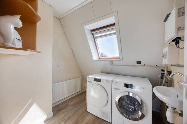 De tweede verdieping is ruim opgezet en beschikt over twee volwaardige slaapkamers. Dankzij de dakramen genieten beide kamers van een prettige hoeveelheid natuurlijk licht, wat zorgt voor een lichte en aangename sfeer. Aan de voorzijde bevindt zich een ruime, aparte wasruimte met aansluitingen voor de wasmachine en droger, evenals een praktische wastafel. In deze ruimte is tevens de omvormer van de zonnepanelen geplaatst. Aan de achterzijde van de woning is een afgesloten technische ruimte waar de cv-ketel en zonneboiler zijn opgesteld. Tot slot beschikt deze verdieping over een ruim dakterras aan de achterzijde.